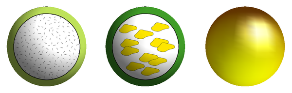 Schematische Mikrogranulate (von l. nach r.): Mikrokapsel mit fester Hülle und homogenem Kern, Mikrokapsel mit fester Hülle und Zellsuspension als Kern, Mikrokugel aus einer homogenen Mischung von Wirkstoff und Hüllmaterial